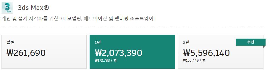 3d에서 떼놓을 수 없는 3d 맥스와 마야입니다.(가격 같음) 영구 라이센스 패키지를 없애버린 탓에 년 단위 갱신 밖에 없습니다. 월단위는 엄청 손해보기때문에 1년이나 3년 단위로 해야 조금 싼 편입니다.