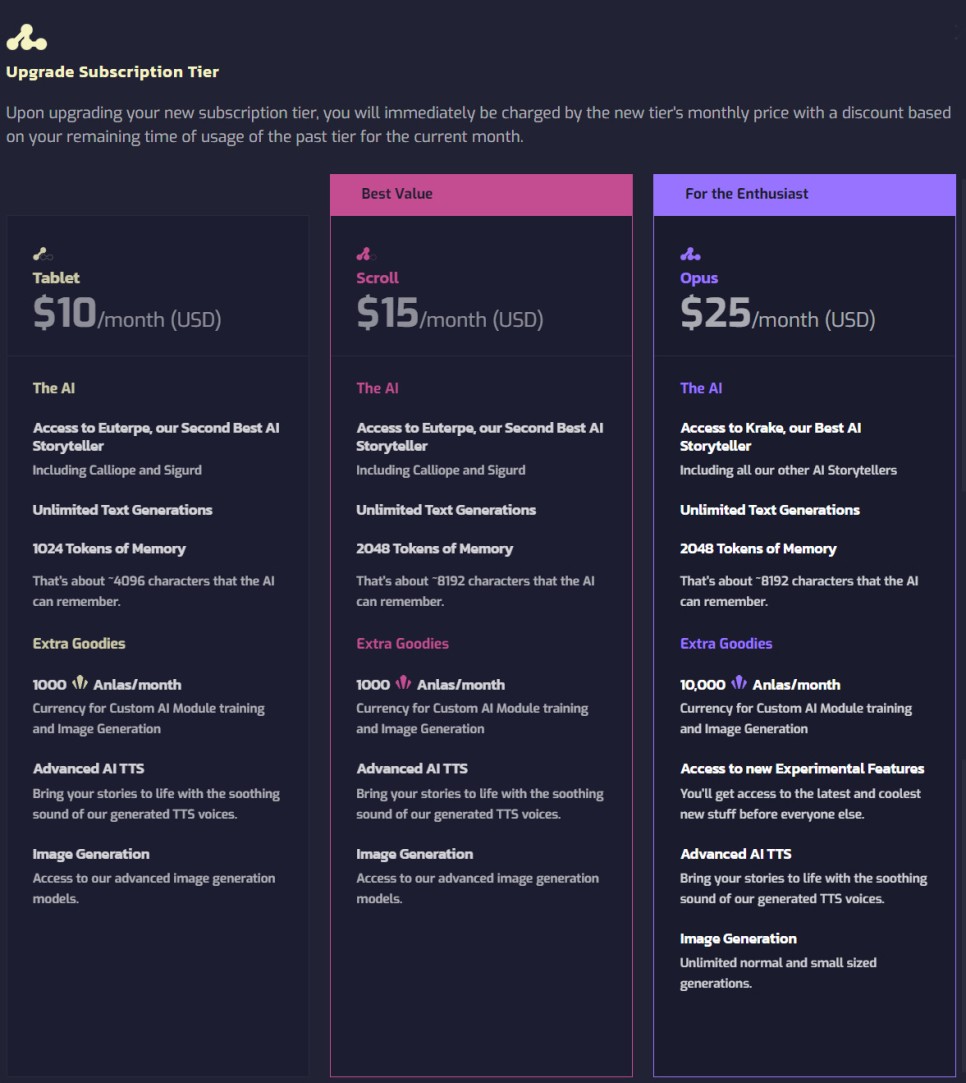 주의할 점은 유료 플랫폼입니다. 기본이 월 10달러(Tablet)이며 15달러(Scroll) / 25달러(Opus) 이렇게 있습니다. AI 소설 기능을 사용한다면 Scroll이 가장 합리적이지만, AI 그림 기능만 사용할 거면 Tablet이나 Scroll이나 똑같아서 Tablet 티어 쓰시면 됩니다.