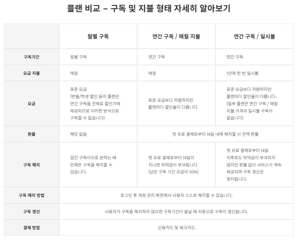 이러한 플랜을 구매할 때 유의점은 연간 구독을 월별로 나눠서 결제하는 방식이기에 구독 중 해지하면 수수료를 물게 됩니다. 저렴하게 보이는 이유입니다. 매달 만원 수준의 소액이라 깜빡하고 잊어먹을 수 있기도 하고 하니 해지가 필요하다면 연간 구독 결제 후 1년이 도래하기 직전에 구독 해지를 하셔야 수수료를 안 물어냅니다. 저는 11개월 차쯤에 해지하려니까 5,500원 내놓으라고 뜹니다.