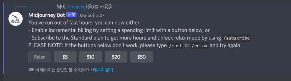 사용법은 하단 채팅창에 /imagine를 입력하고