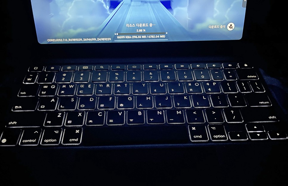 키보드 느낌은 일반 노트북 쓰는 느낌이었습니다. 노트북에 비해 불편하다는 것도 못 느꼈고 키감이 생각보다 좋았습니다. LED도 탑재되어 있어서 야간에 잘 보이고 불필요하면 끌 수 있습니다. 기능 키들이 윈도 키보드와 좀 다르게 생겨서 적응이 필요합니다.