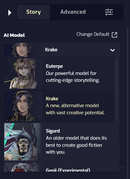 마지막으로 [AI Model]이 있는데 모듈과 다른 점은 전체적인 AI 성능에 영향을 주는 기능입니다. Sigurd가 가장 처음 나온 모델이라서 성능이 가장 낮고, 그다음으로 Euterpe, 그리고 최신 버전인 Krake가 있습니다. 아무래도 성능이 높으면 상황 파악이나 멍청한 소리를 하는 것이 줄어듭니다. 별개로 Genji라는 모델은 일본어 모델입니다. 일본어로 출력되고 입력됩니다...