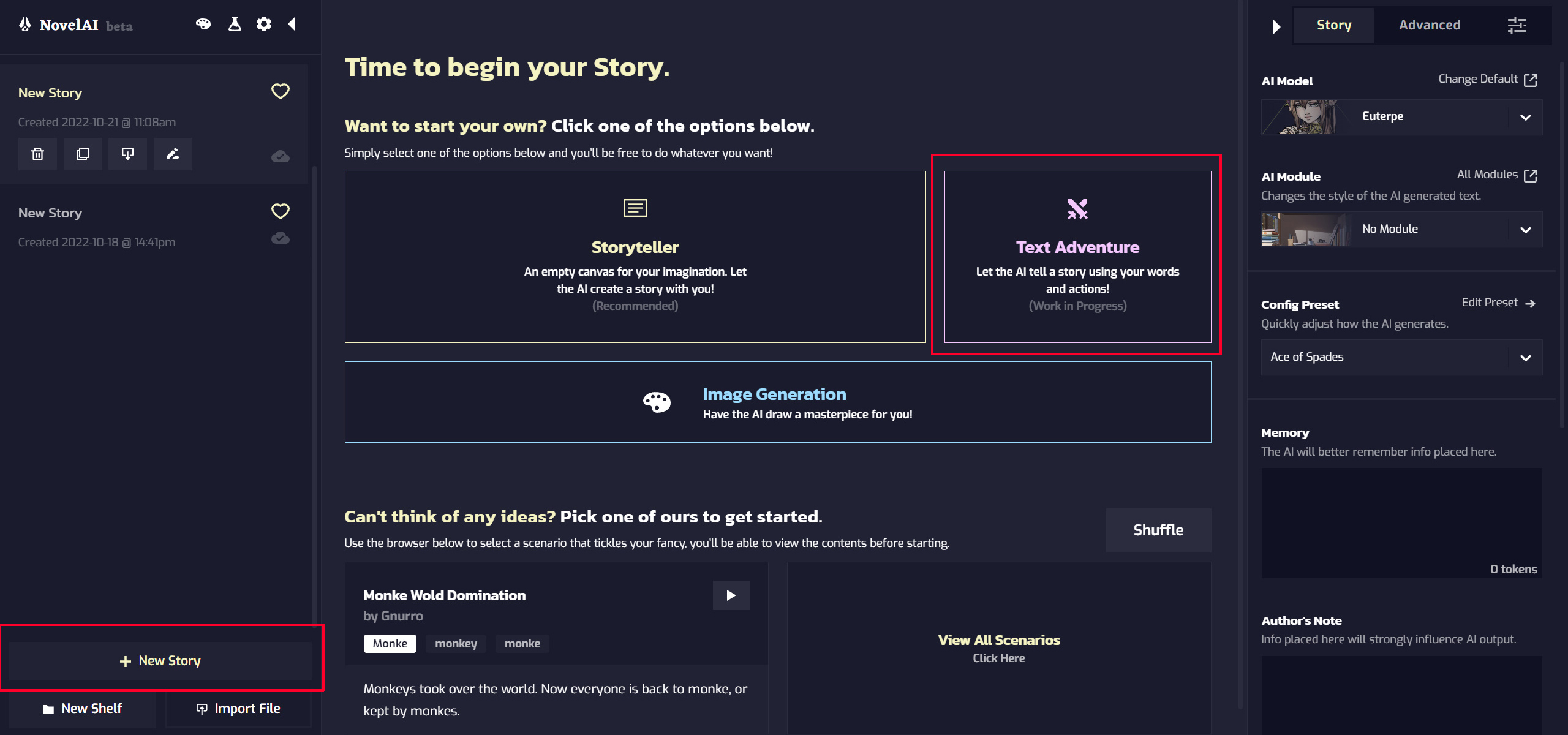 첫 페이지를 보면 [Storyteller]와 [Text Adventure] 그리고 아래쪽에 [Image Generation]이 있습니다. [Storyteller]는 아무것도 없는 백지상태에서 글을 쓰는 방법이라 난이도는 높지만 그만큼 훌륭한 자유도를 자랑합니다. 그리고 주로 1인칭, 3인칭 시점으로 글을 쓰면 효율적이고요.