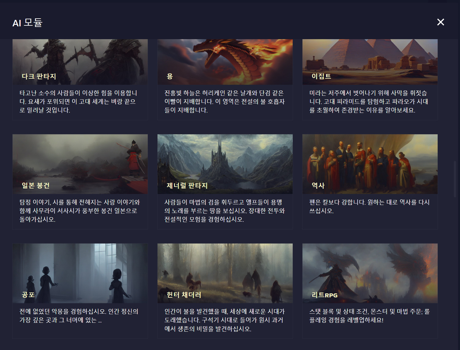보통은 판타지 소설을 기반으로 하지만, 다양하게 학습된 데이터의 모듈들이 존재합니다. 특정 소설 작가, 혹은 19세기, 사이버펑크, 다크 판타지 등 본인이 원하는 테마의 모듈을 사용해 좀 더 깊이감 있게 소설을 쓸 수 있습니다