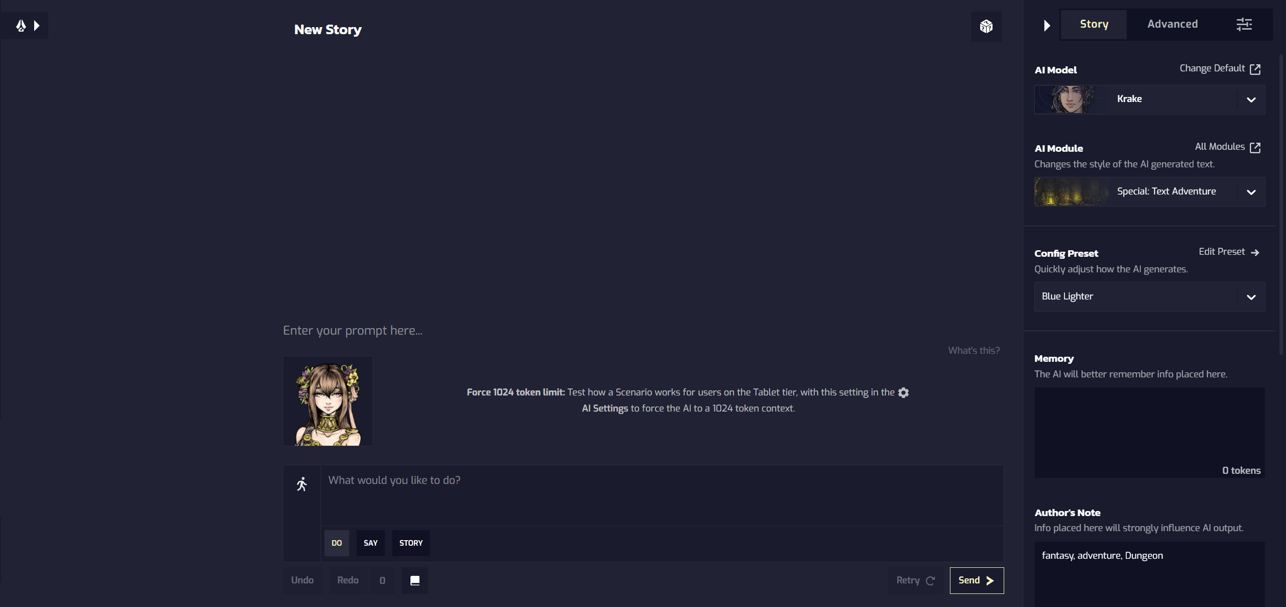 다른 [Text Adventure]는 2인칭 시점에서 주고받듯이 글을 쓰는 시스템입니다. AI와 주고받듯이 소설을 써 내려가는 TRPG 느낌이 나기에 개인적으로 입문자들에게 추천하는 방식입니다.