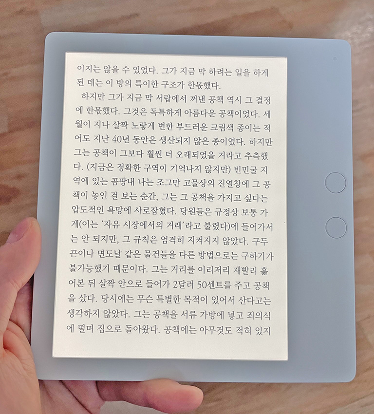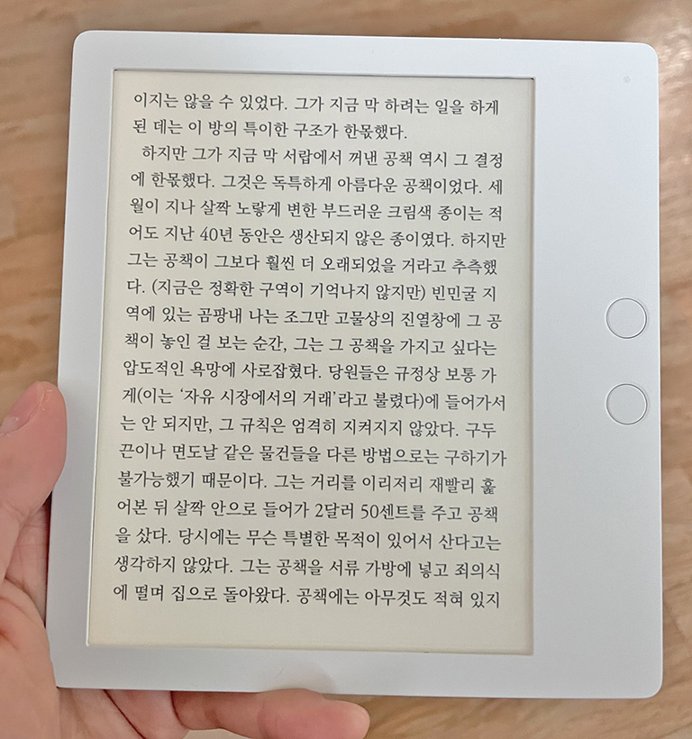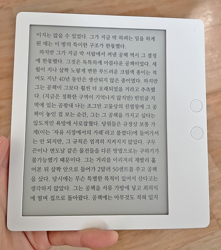 확실히 글자 읽는 게 태블릿보다 훨씬 편안합니다. 가독성도 좋고 눈에 부담도 없고 무게도 굉장히 가벼워서 작은 노트 한 권 수준밖에 되지 않습니다.