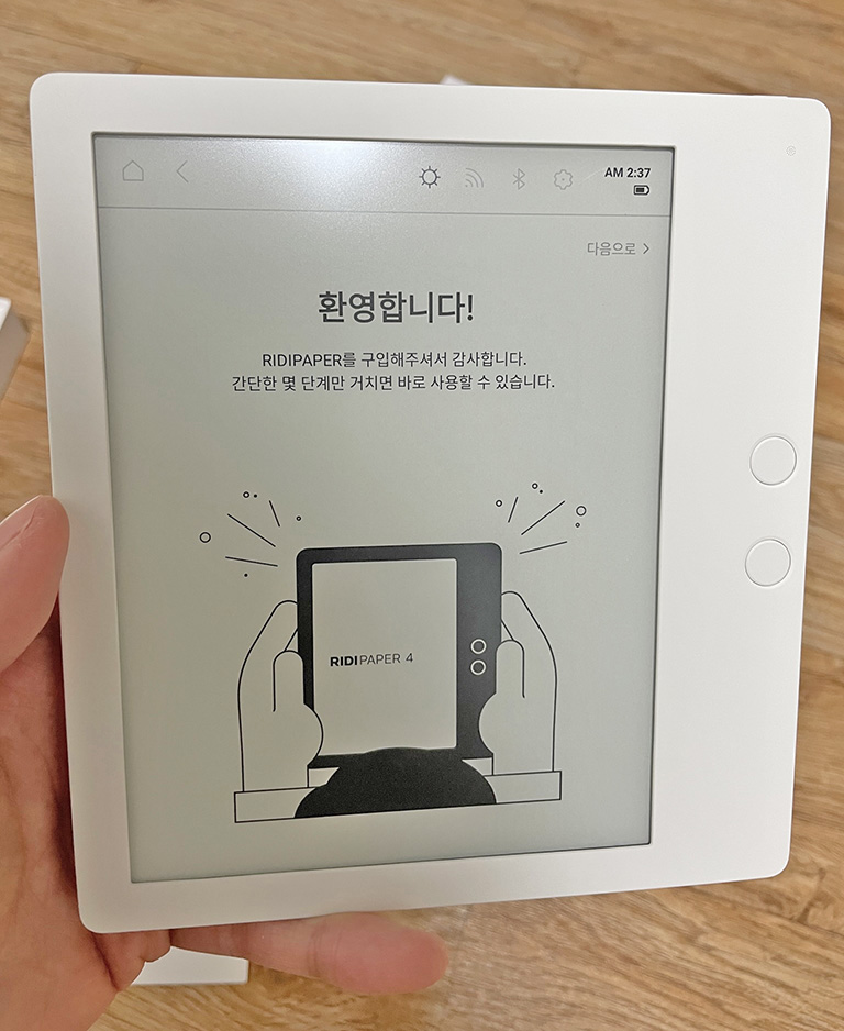 처음에는 본체 액정에 그림이 붙어있나 싶었는데 전자 잉크 디스플레이라서 계속 켜져 있는 거였습니다. 설명서대로 본체 전원 버튼을 꾹 눌러서 켜면 됩니다.