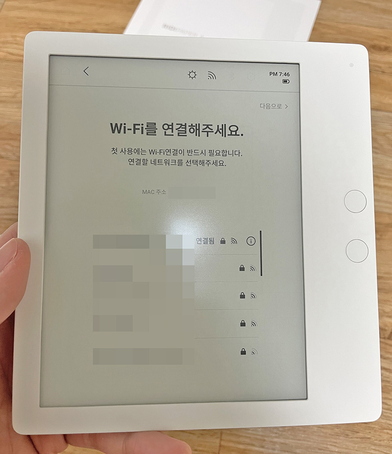 전원이 제대로 켜진다면 와이파이를 설정하고 리디 아이디를 로그인하게 됩니다. 업데이트하라고 뜰 텐데 첫 설정할 때는 스킵 하는 게 낫다고 합니다. 첫 설정 중에 업데이트하면 문제 생겨서 화면 겹침이나 멈춤 현상이 생길 수 있다네요.
