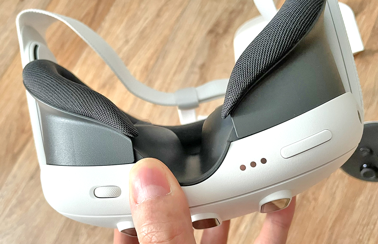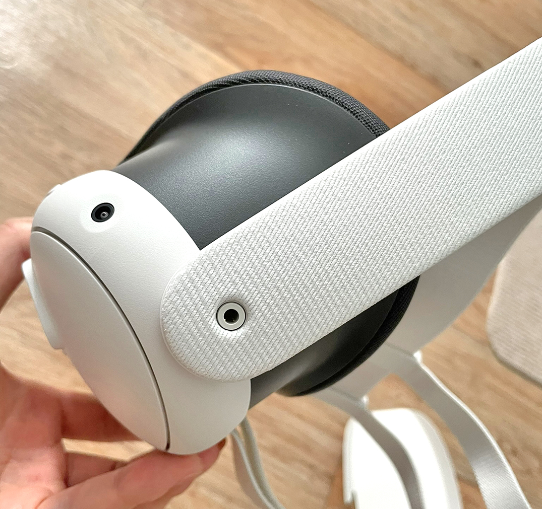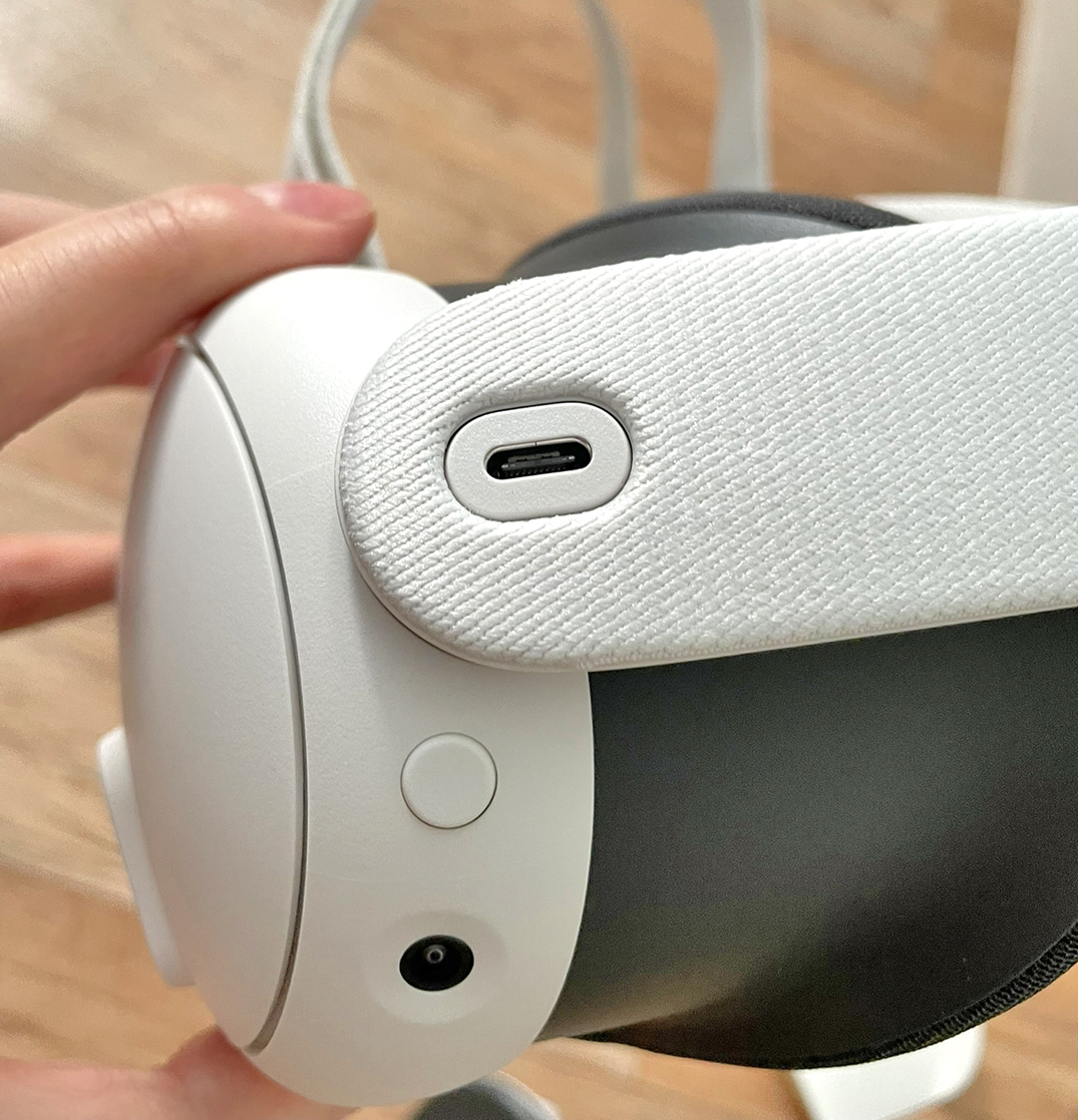 좌측에는 USB-C 단자와 전원 버튼이 있으며, 우측에는 오디오 잭이 있습니다. 퀘 2는 본체에 단자가 있었는데, 이번에는 공간 절약을 위해서인지 스트랩 부분에 있습니다. 그래서 그런지 두께가 더 커졌고 퀘스트 2 때 스트랩들이 호환이 되지 않게 되었습니다. 굉장히 아쉽네요.