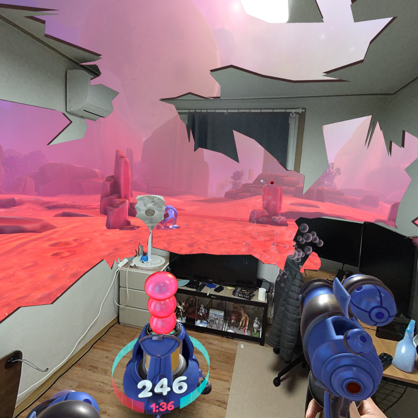 퀘 3는 착용하자마자 MR 화면을 띄워줍니다. 외부의 상황과의 딜레이가 없이 바로바로 보여주며, 화질은 깔끔하진 않지만, 휴대폰 액정의 글이 읽힐 정도는 됩니다. 착용한 채로 컴퓨터로 자료 찾고 검색할 정도도 가능하고요. 퀘 2의 흑백 패스스루에 비하면 정말 좋아졌습니다. 가장 크게 체감되는 것이 이 기능이었습니다.