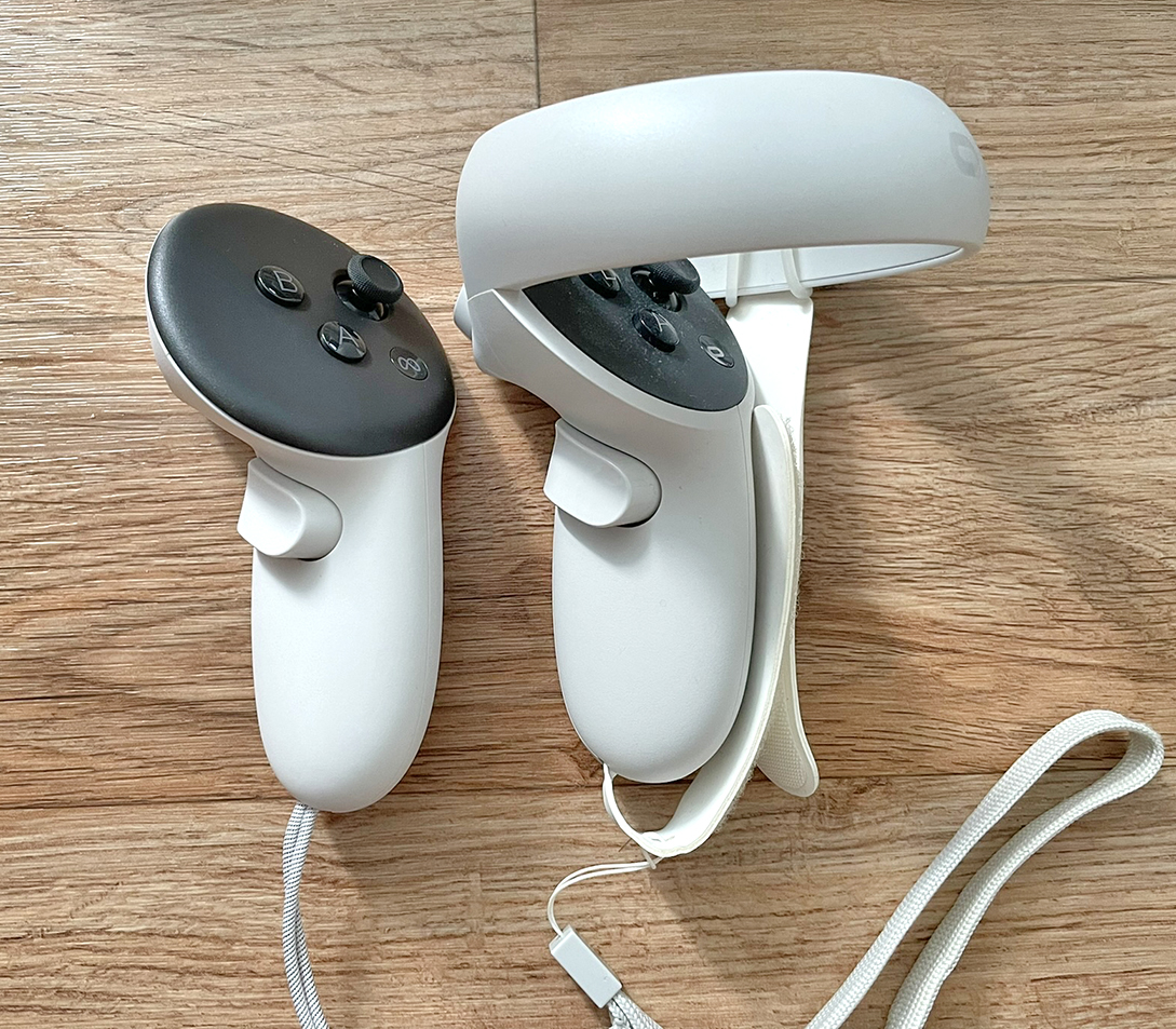 달라진 컨트롤러. 퀘 2 컨트롤러에 있던 링이 사라져서 매우 작아진 것처럼 보입니다. 배터리 분리 방법도 이전에는 손톱으로 뜯어내듯이 빼야 했는데, 이제는 그냥 버튼을 꾹 누르면 탈착 됩니다.