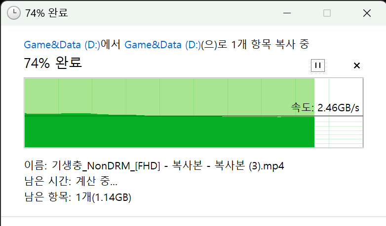 5GB 파일 복사 붙여넣기 해보았습니다. 둘 다 순식간에 끝나긴 하는데, 표기 속도는 P5 Plus가 더 높았습니다...? 저장 장치 쪽 벤치마크는 영 모르겠네요.